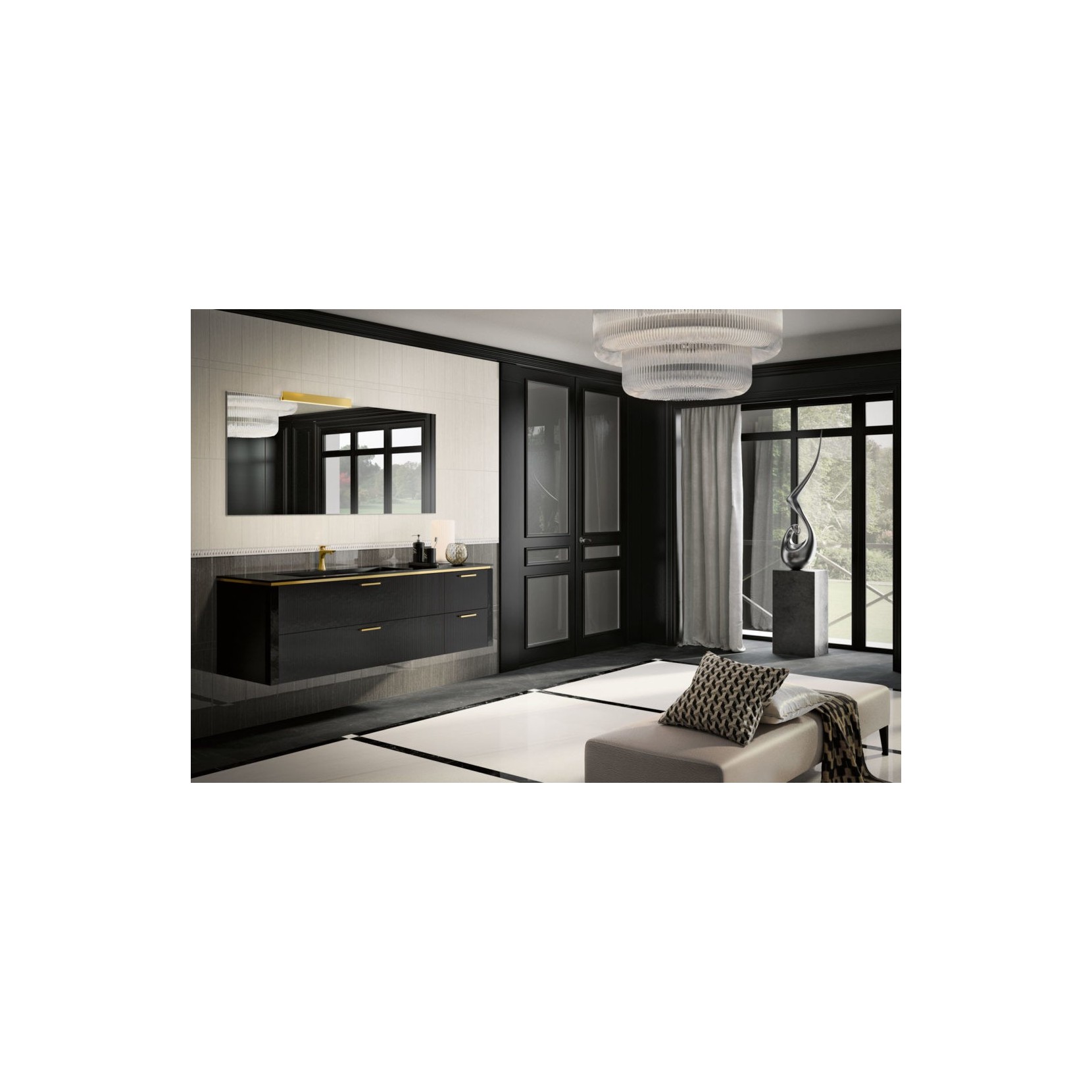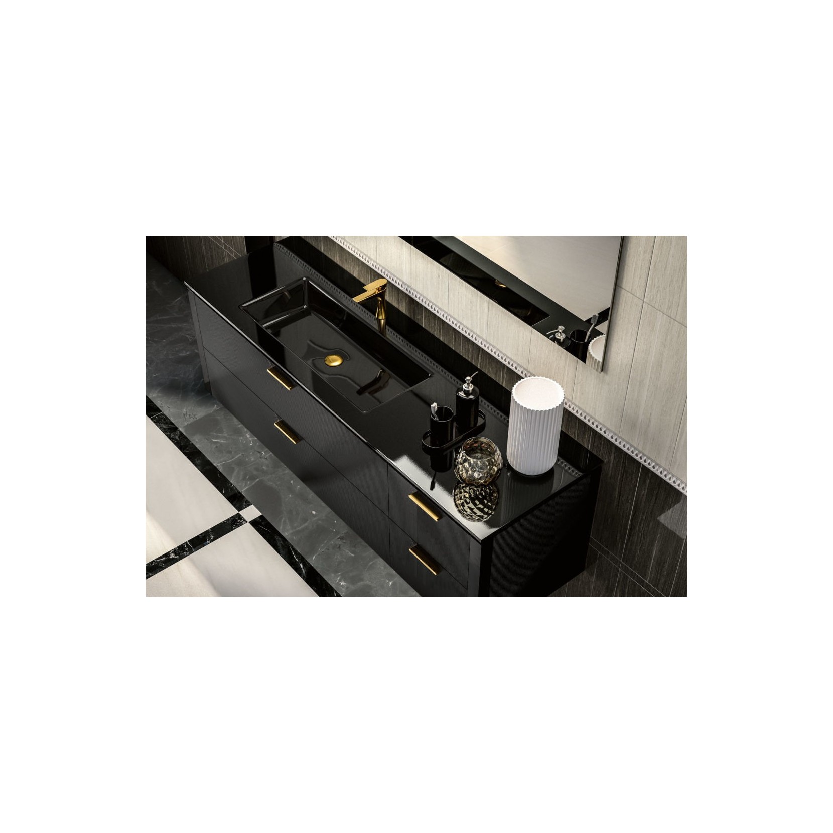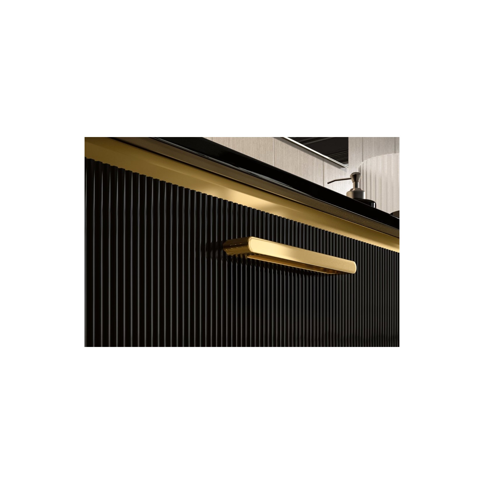 Top in vetro Nero 033 lucido. Specchio filo lucido con lampada Cover finitura oro.