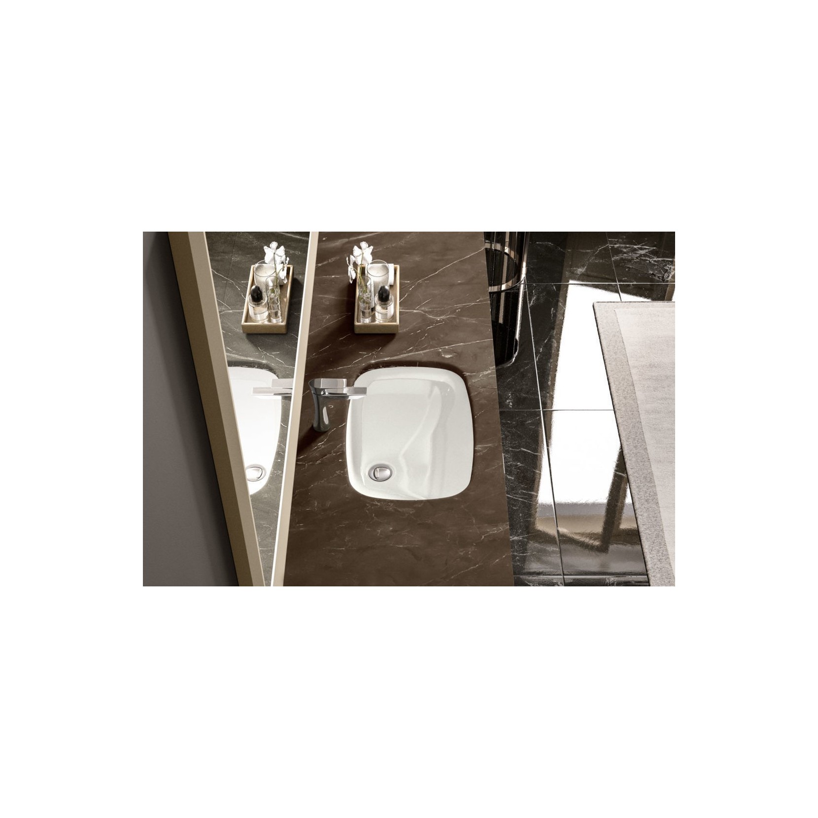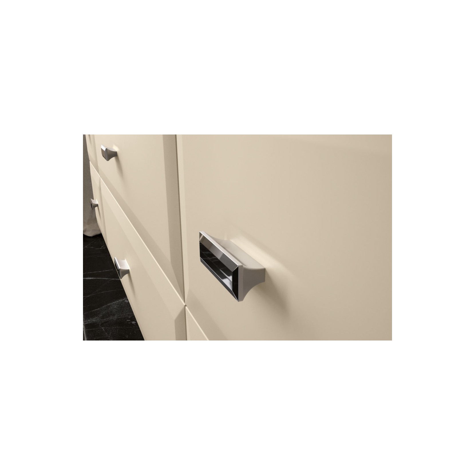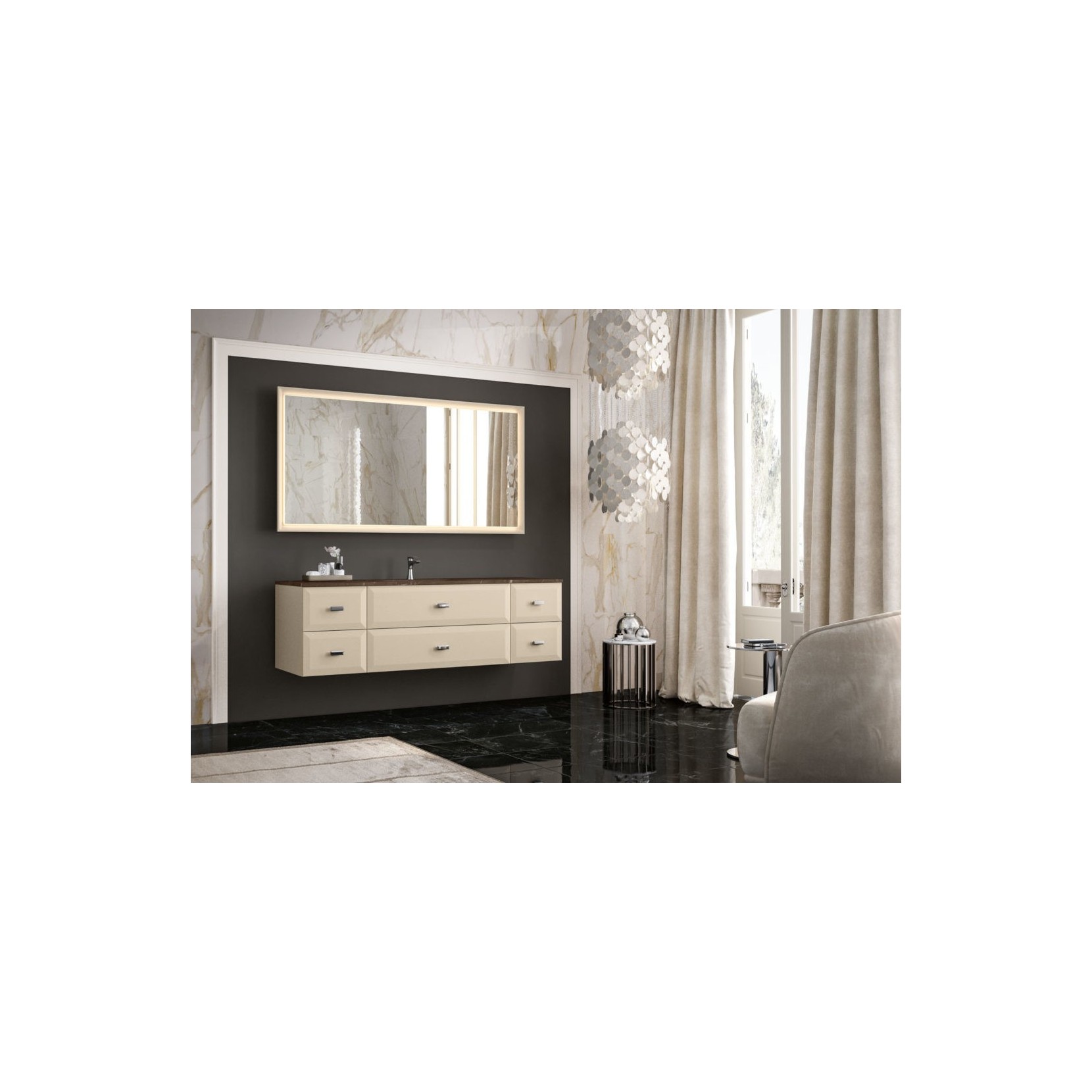 Base portalavabo e anta Sabbia 043 opaco, top in marmo Bronze Amani. Specchio retroilluminato con cornice Sabbia 043 opaco.