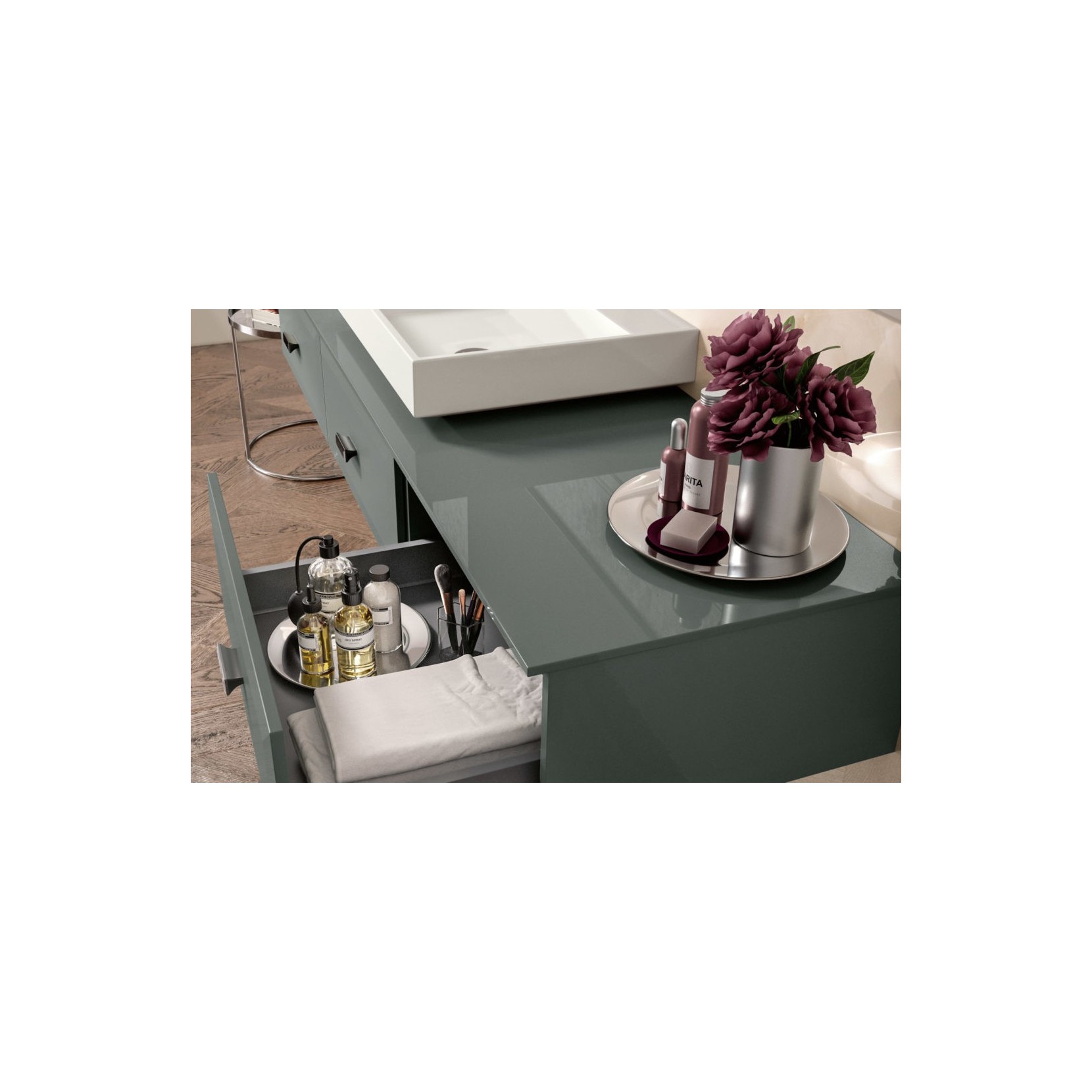 Base portalavabo e anta finitura Mirto 070 lucido, top in vetro Mirto 070 lucido.