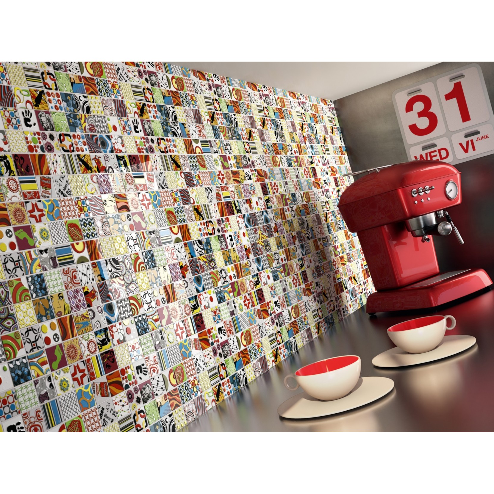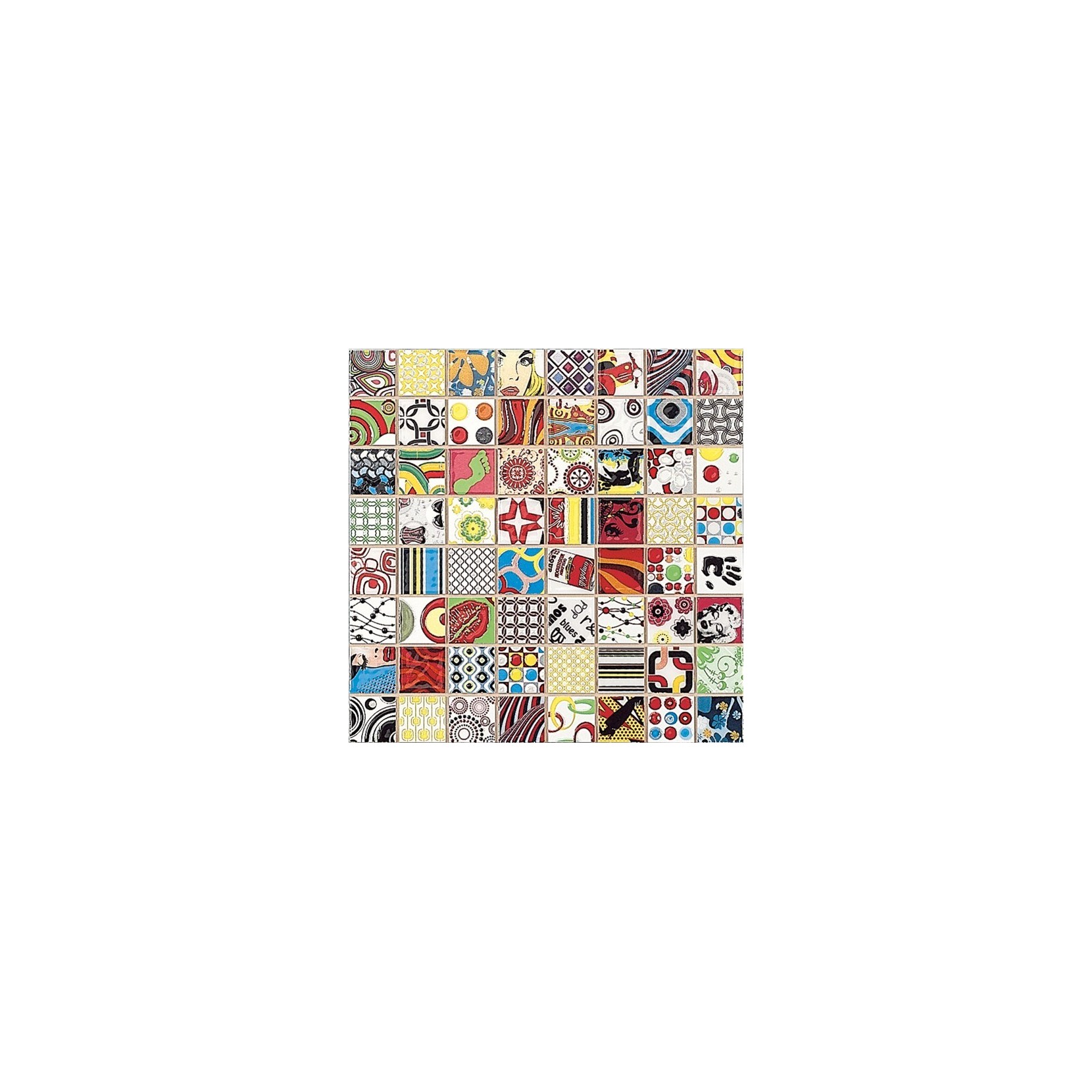 Mosaico in ceramica in stile Pop Art con un bassorilievo composto da 64 quadrati tutti diversi e colorati.