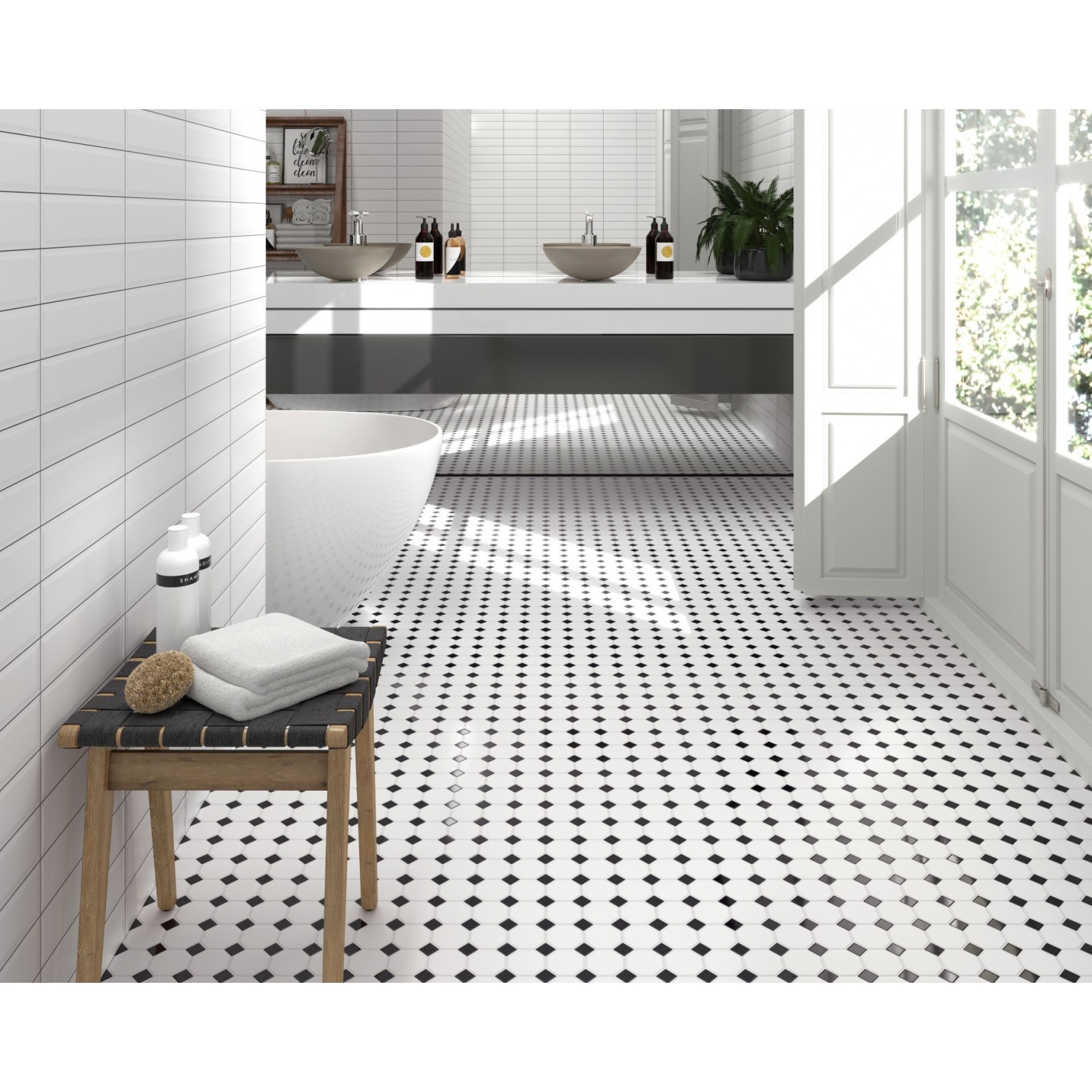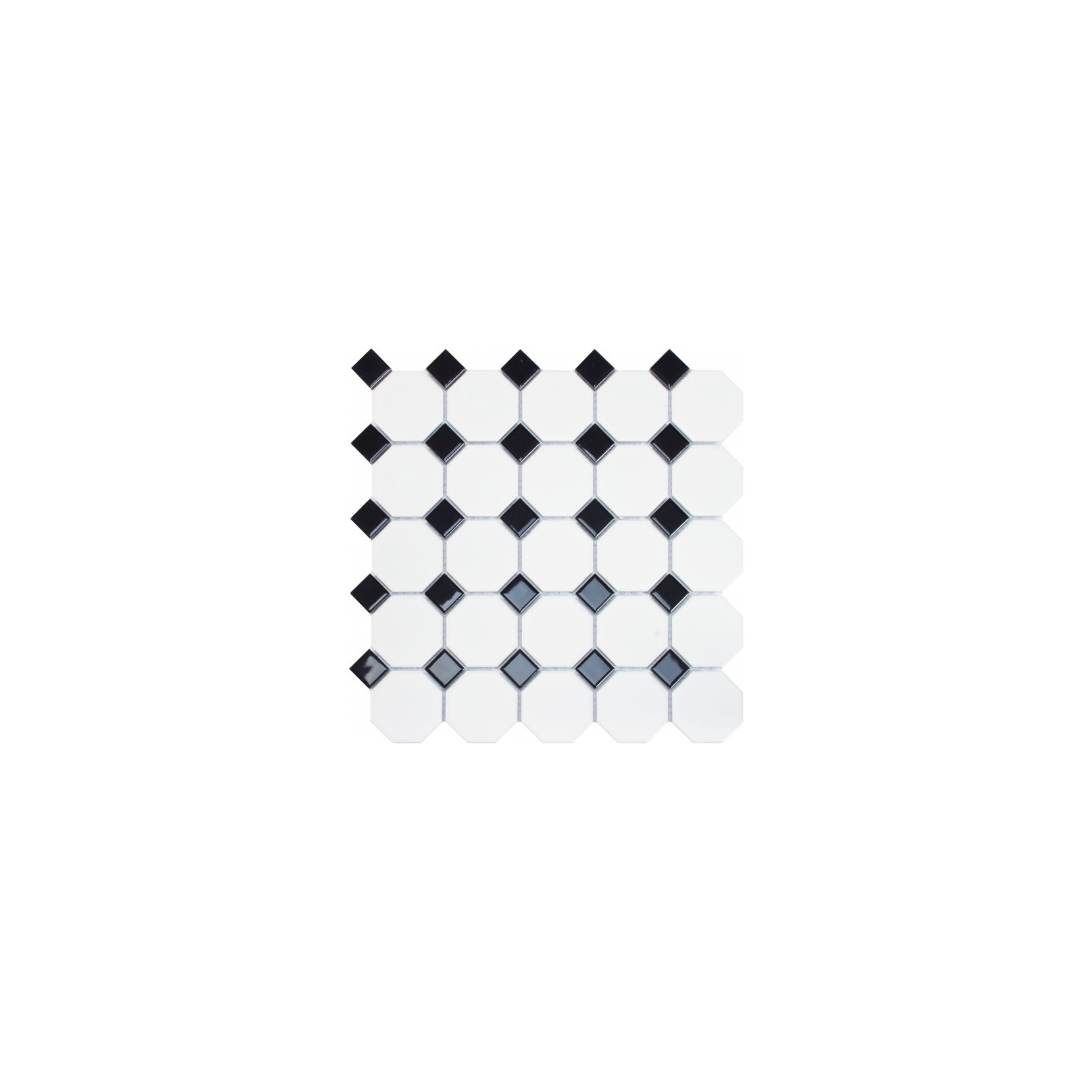 Mosaico in gres porcellanato con fondo bianco opaco e tozzetti nero lucido.