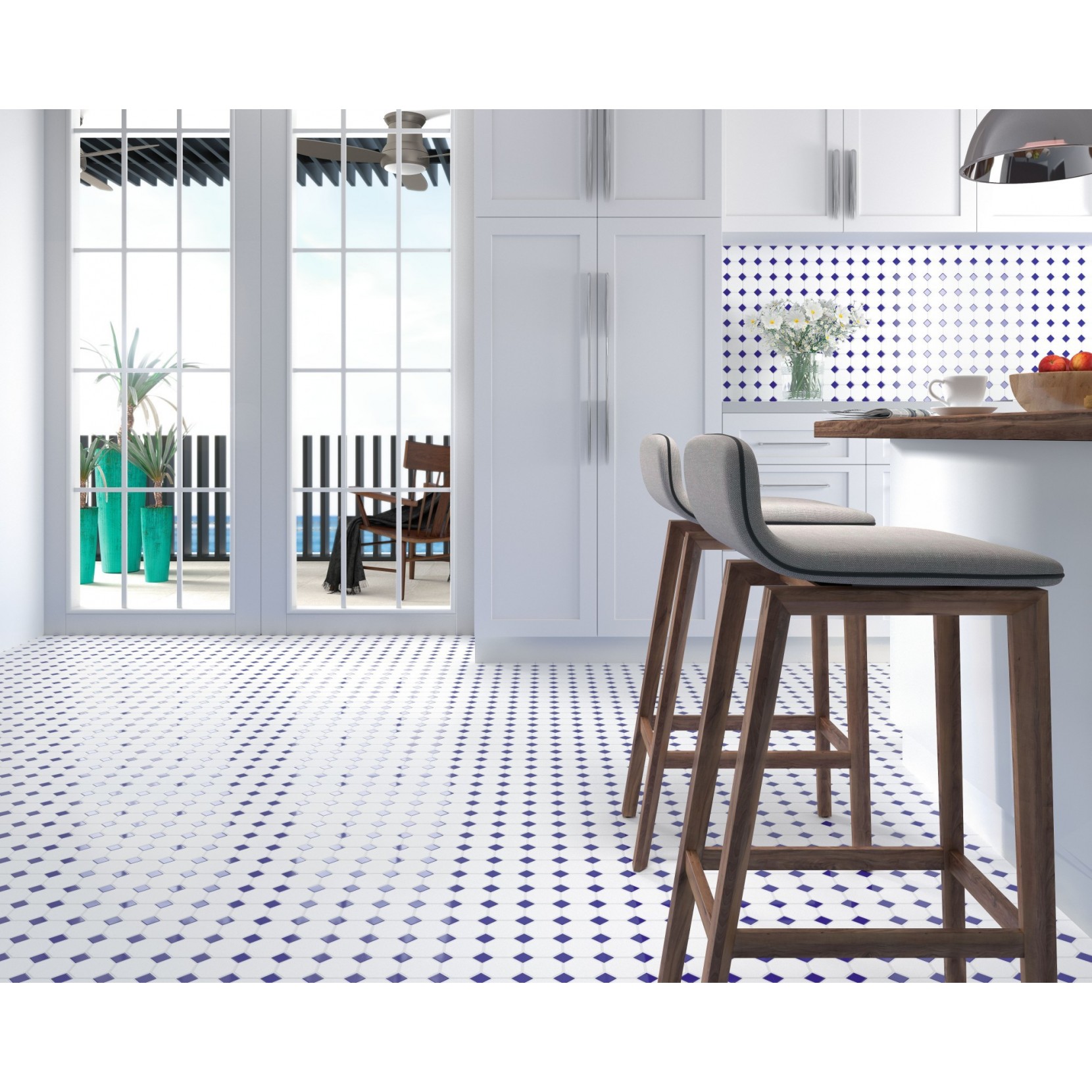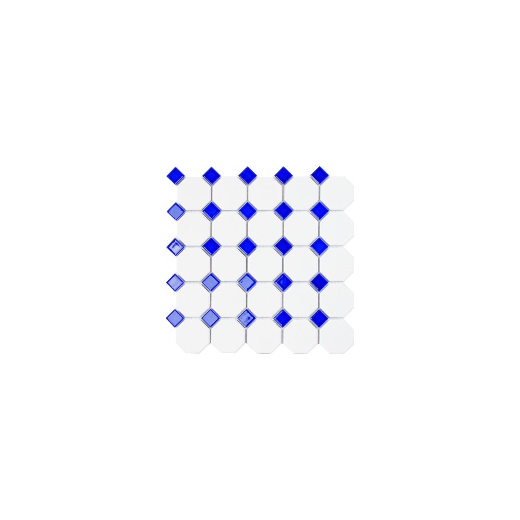 Mosaico in gres porcellanato con fondo bianco opaco e tozzetti blu lucido.