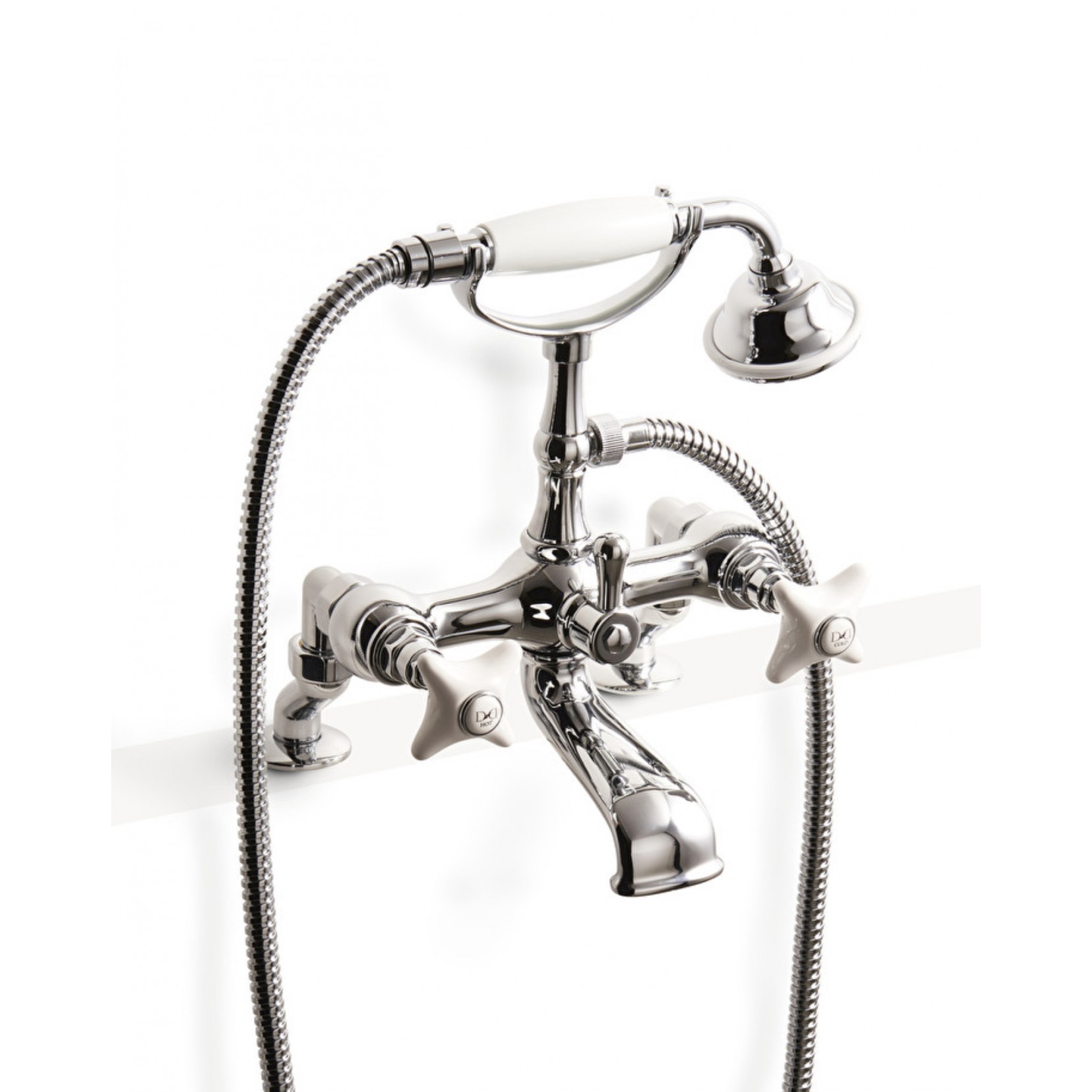 Il gruppo vasca per montaggio bordovasca con doccetta e flessibile, della serie White Rose è di forte ispirazione in stile inglese. White rose è resa inconfondibile dalla leva a croce in fine ceramica bianca. Disponibile in diverse finiture di colore: Cromo, Bronzo, Nickel lucido e Oro Chiaro