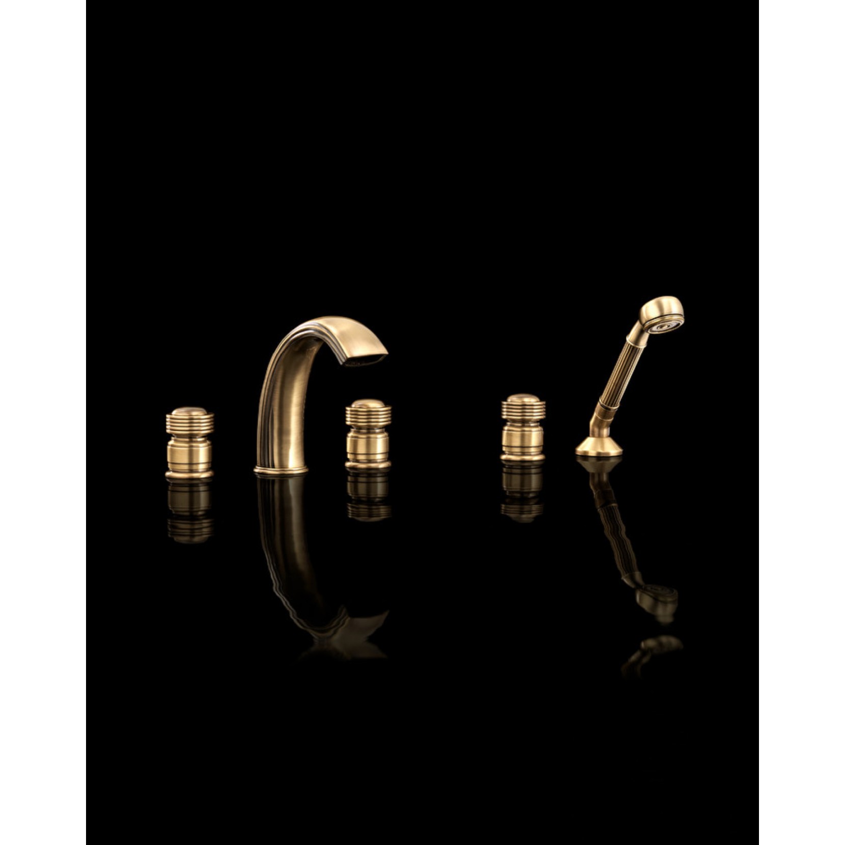 Il gruppo vasca per montaggio bordovasca 5 fori, con deviatore e doccetta, della serie ROYAL, è una reinterpretazione dell'Art Decò. L'elegante scanalatura accompagna ed evidenzia le solide geometrie, ottimo per sale da bagno di forte personalità. La struttura in ottone, è disponibile in finiture: Cromo, Nickel lucido, Oro chiaro e Oro 24K.