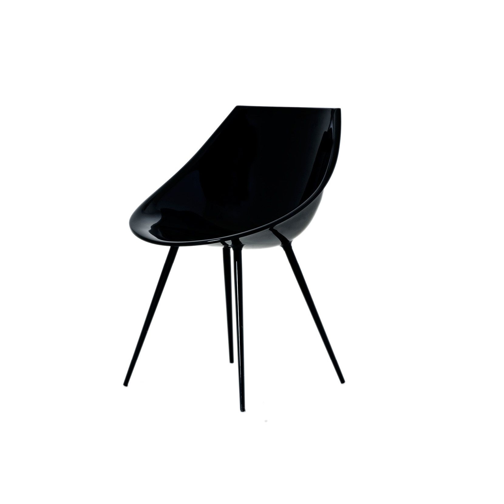 Una scocca avvolgente e luminosa in poliuretano rigido sorretta da gambe a spillo in alluminio laccato.