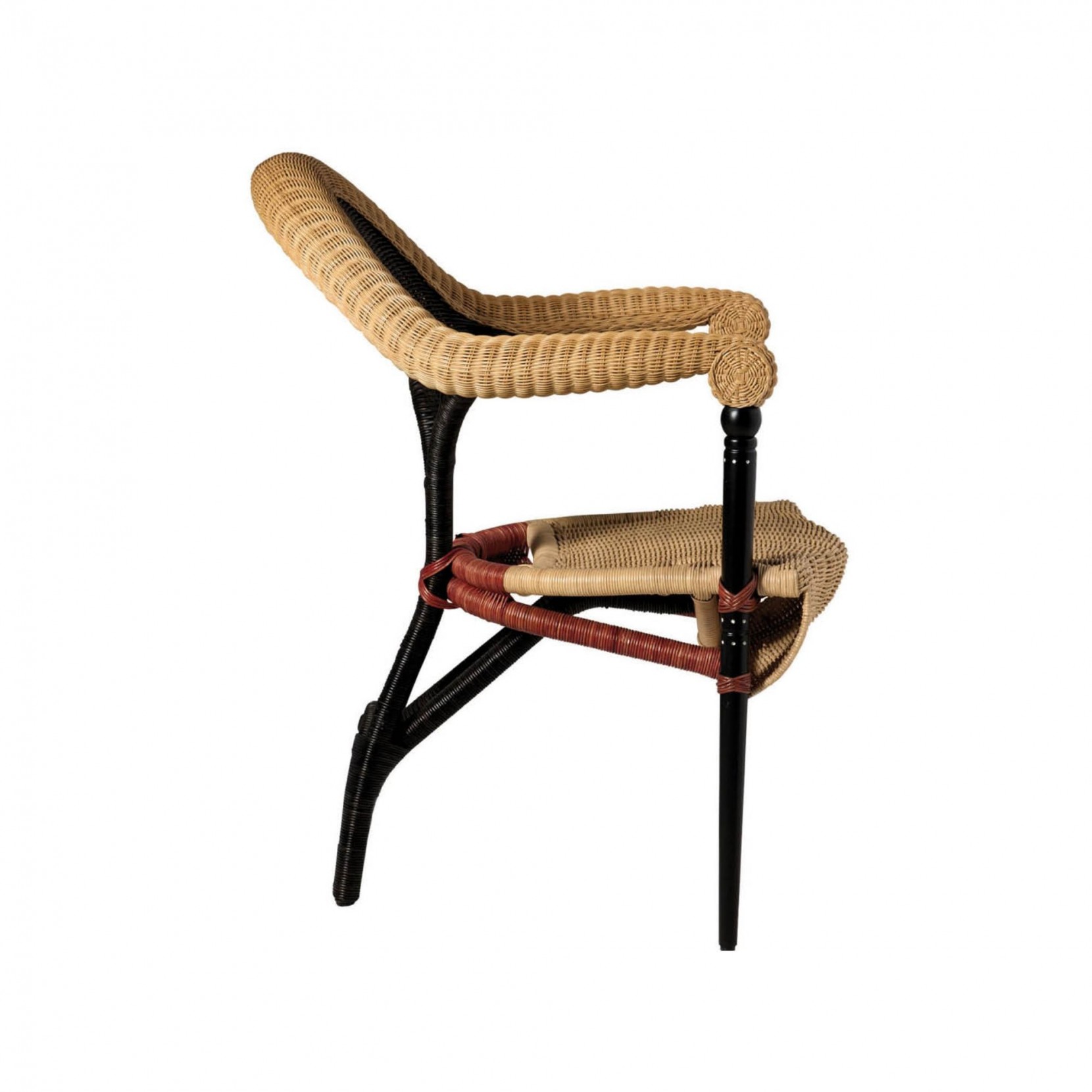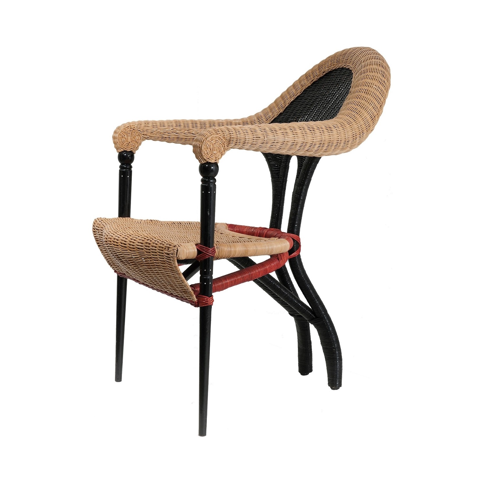 Una poltroncina tra il barocco ed il cubismo in rattan e midollino; le gambe in massello di legno ebanizzato. Disegnata da Borek Sipek, famoso artista artigiano capace di combinare e piegare la materia ai suoi desideri.