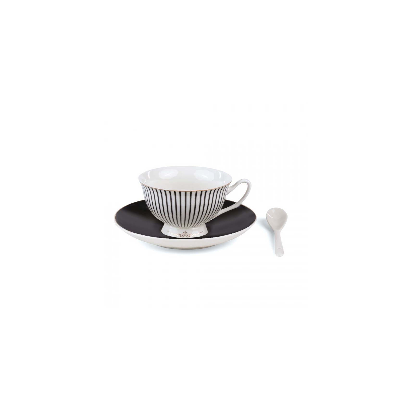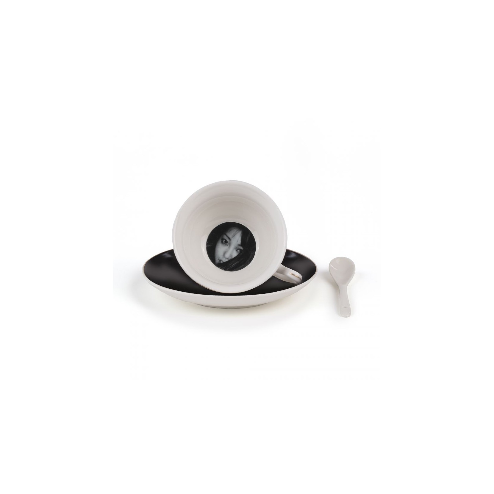 La collezione GUILTLESS proposta dal designer Train rappresenta l'eleganza della seduzione, mantenendo il desiderio della conquista ma non di vittoria con la sua particolare grafica. Infatti il designer ha combinato due differenti stili: il classico della tazzina e la stampa moderna che si trova al suo interno. La particolare tazza da tè è completa di piattino e cucchiaino in fine porcellana bianca arricchita da un bordino dorato.
