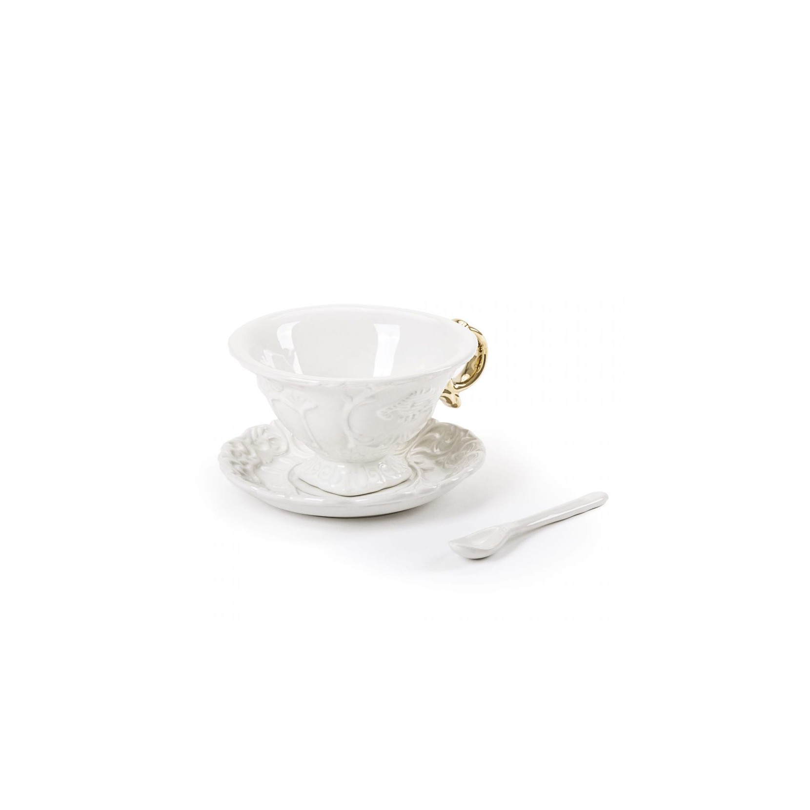 Seletti con la serie I-WARES GOLD proposta dal designer Selab è la linea da tavola in fine porcellana bianca arriccita da manici in finitura oro. Il designer con questa serie di tazze, teiere e zuccheriere d'ispirazione barocca ha saputo rendere oggetti di uso quotidiano brillanti, eleganti e sofisticati.