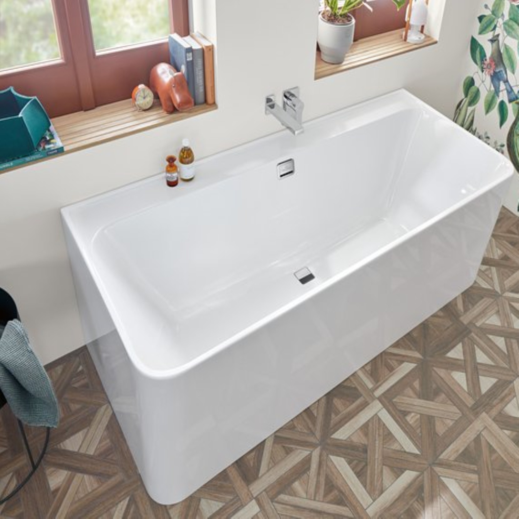 Vasca da bagno in Quaryl®, particolarmente resistente a urti, colpi e graffi, per istallazione a centro parete. Quaryl®, combina le migliori proprietà del quarzo naturale con la versatilità universale di resine acriliche di alta qualità. Quaryl® può essere modellato, é resistente, liscio al tatto, colore e lucentezza si conserveranno inalterati per anni, per un design dall'aspetto duraturo. È compreso il sistema di scarico e troppopieno.