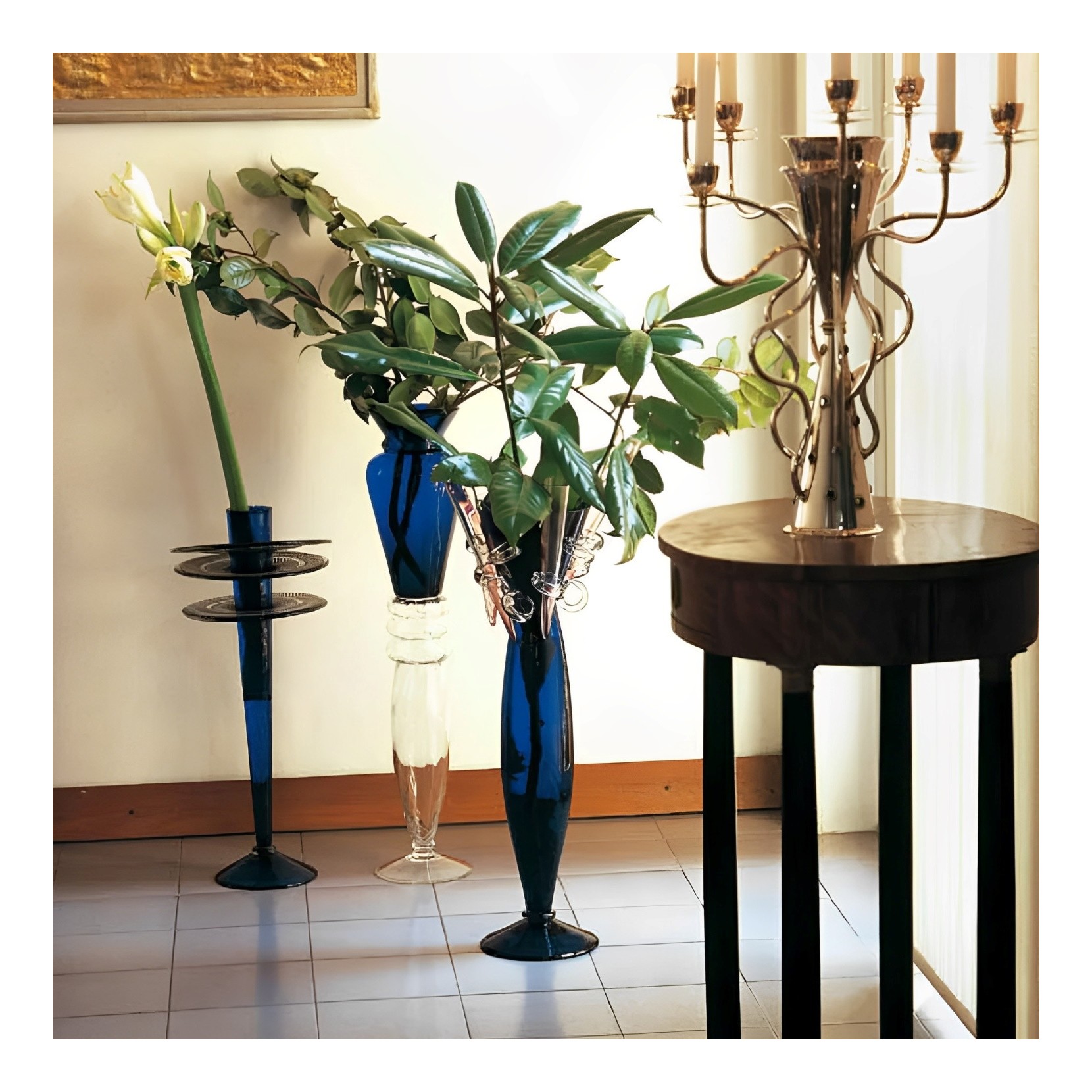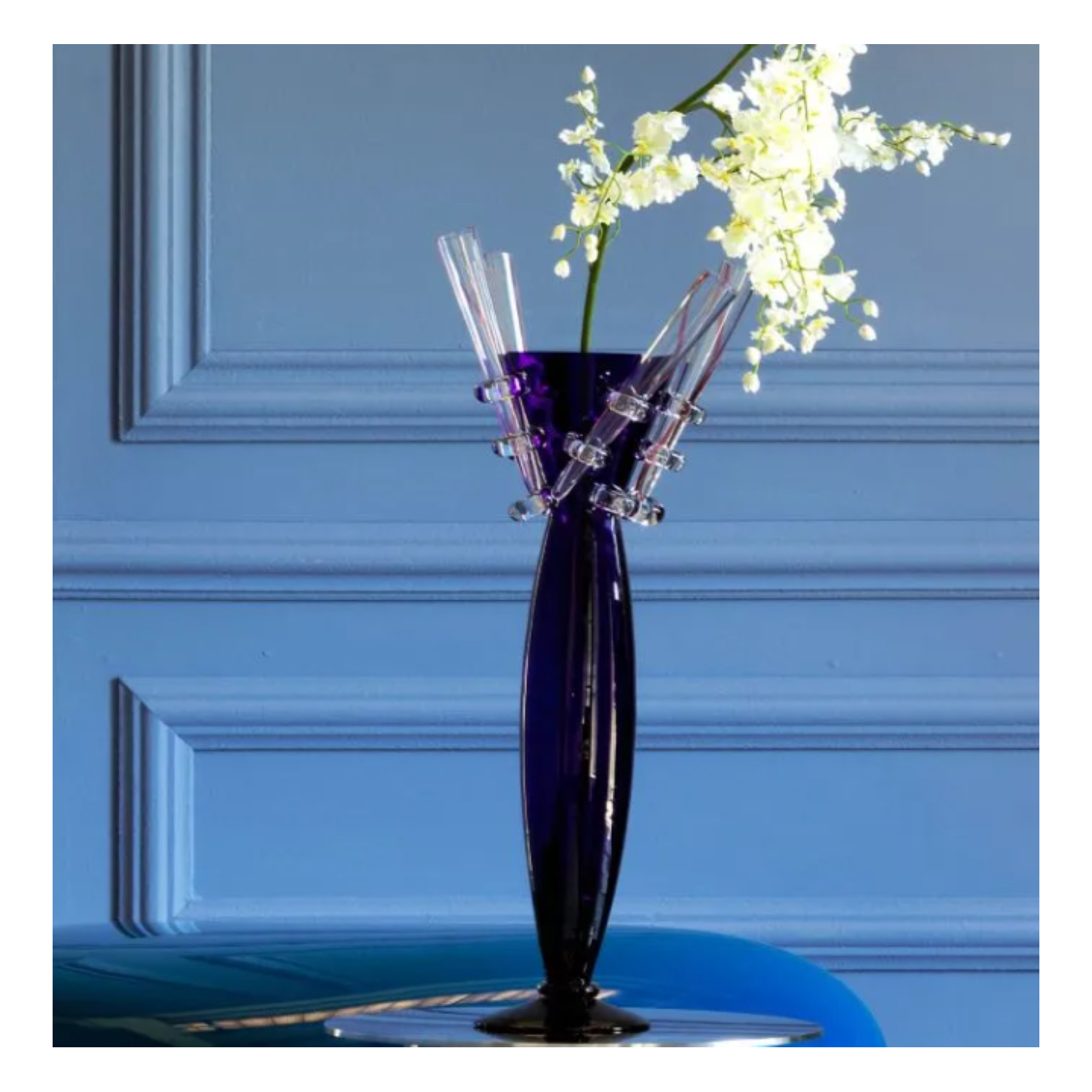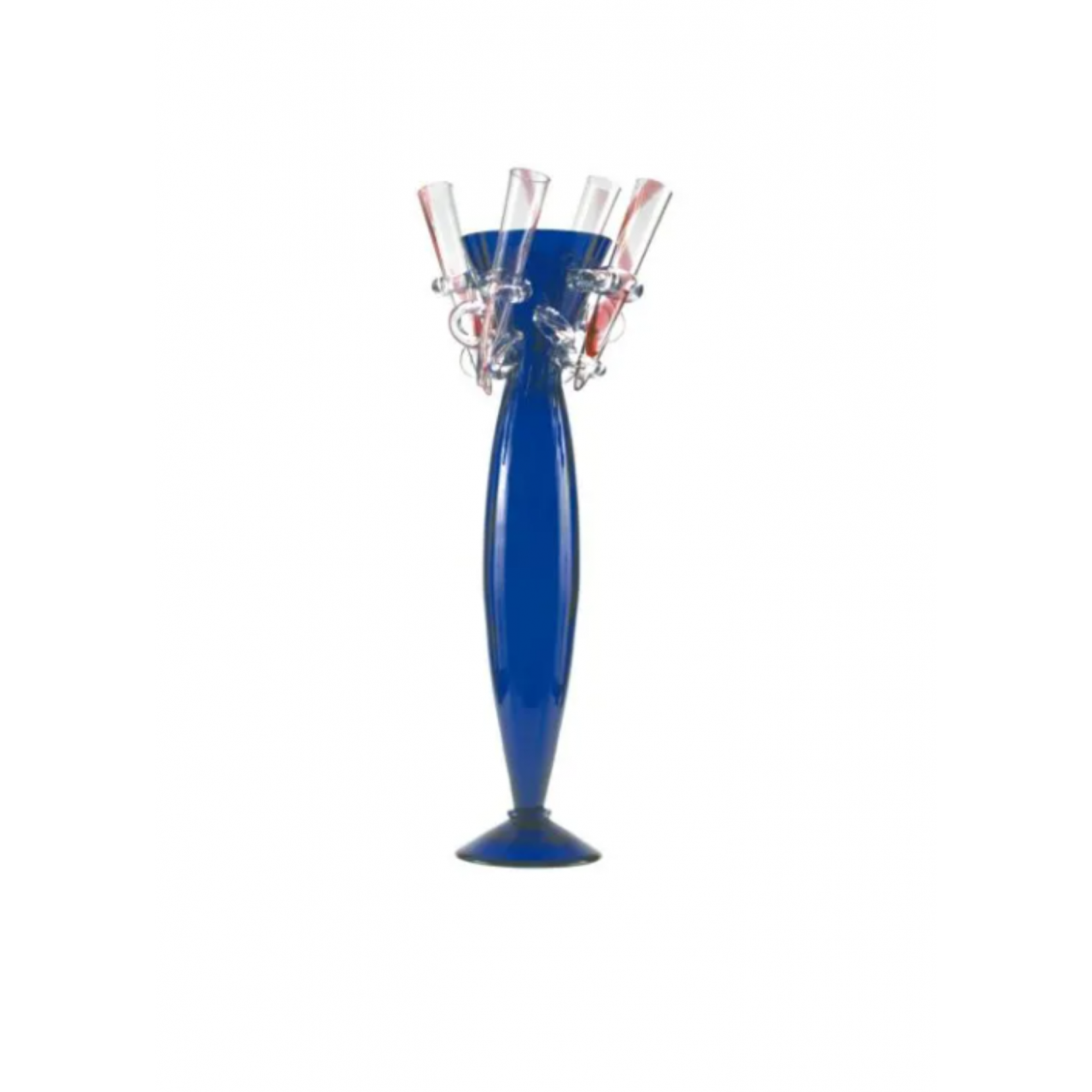 Borek Sipek si può definire un mago del vetro, i suoi oggetti ed idee sono di suggestiva originalità, basandosi su uno stile innovativo che ha saputo creare un'armonia fra oriente ed occidente. Nei sue progetti ha saputo unire le forme di vasi, alzate e centritavola realizzati in diversi metalli: vetro soffiato, porcellana e metallo il tutto realizzati a mano. Amarillide vaso dalle dimensioni generose nei toni del blu cobalto e decorato con cinque piccole ampolle che ne incorniciano il profilo.