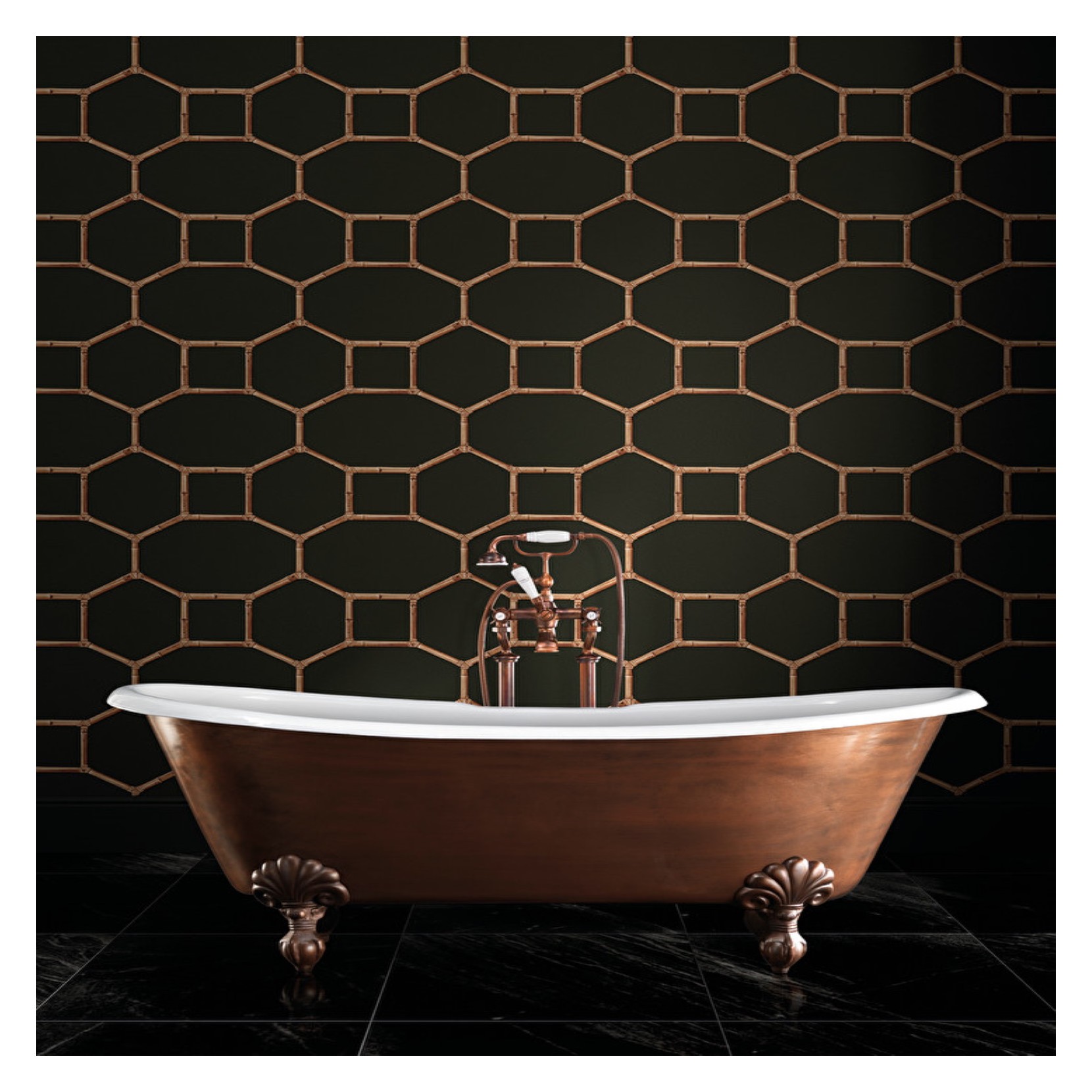 Particolarissima carta da parati con un compostissimo motivo geometrico.
